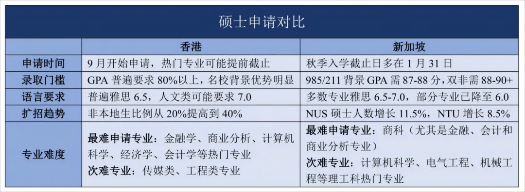 所以,成绩中等、专业不太热门的学生,可能在香港找到更多机会;而想冲击亚洲Top 10、背景扎实的申请者,新加坡是理想战场。