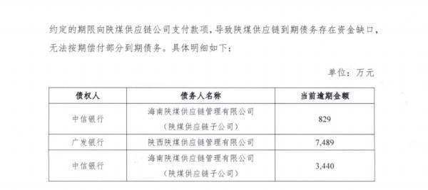陕西煤业化工集团有限责任公司于1月9日发布了一则关于其子公司债务逾期的公告。公告指出,由于关联方瑞茂通未能按时支付款项,其下属子公司陕西陕煤供应链管理有限公司(简称“陕煤供应链”)面临多笔债务无法按期偿还的问题,其中包括对广发银行的逾期债务额达到7489万元。