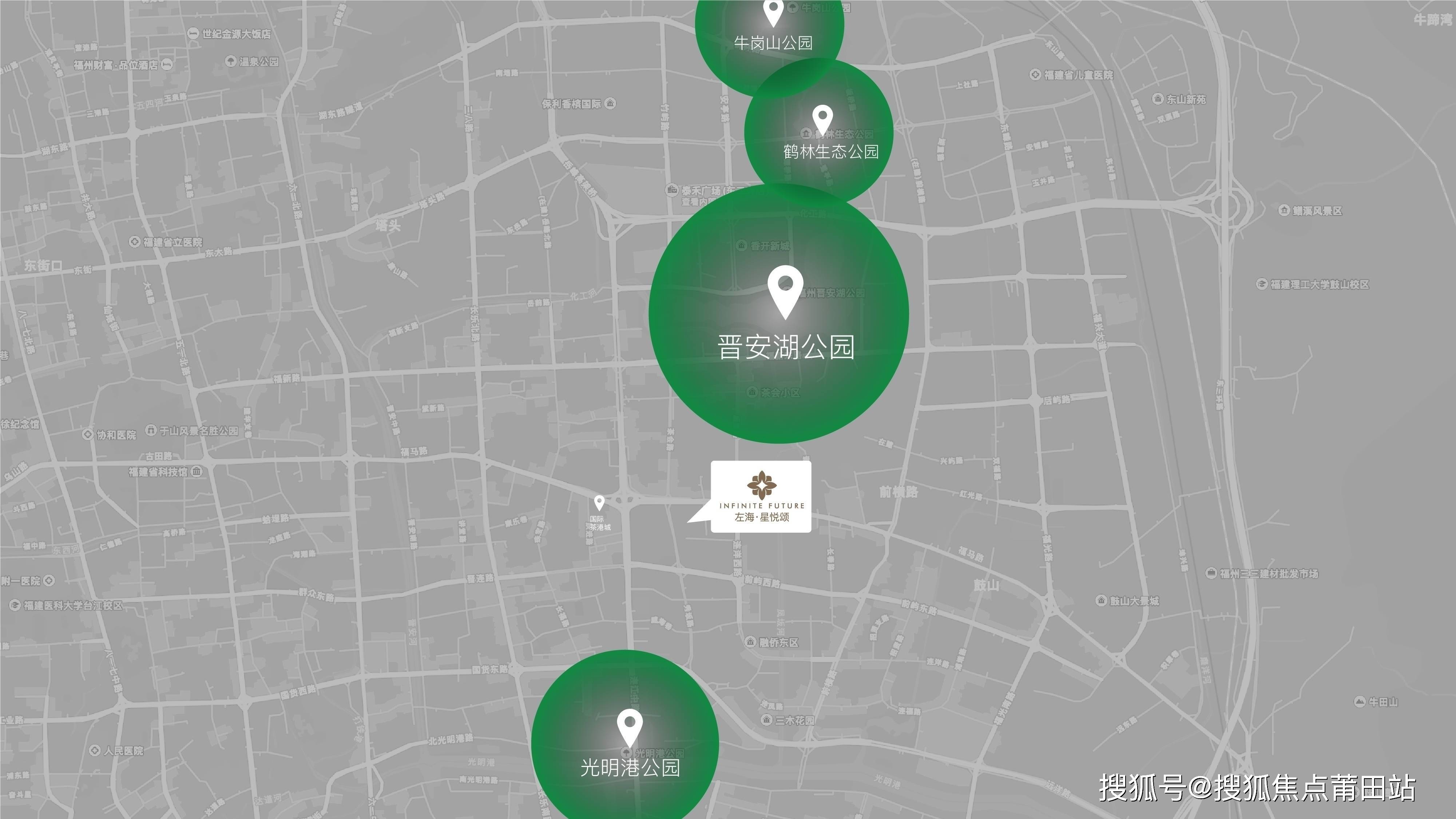 项目周边晋安湖公园、牛岗山公园、鹤林生态公园、光明港公园,围合生态公园群落,造就都会里的诗意栖居地。